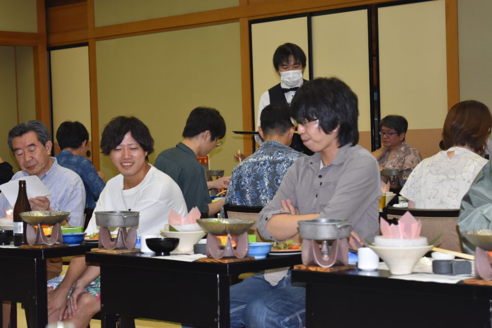 初日の日程が終わり、宴会場にてみんなで夕食の前に旅館の方々のご厚意で準備頂いたたれ看板を後ろに集合写真撮影。撮影後、夕食会がスタート!
